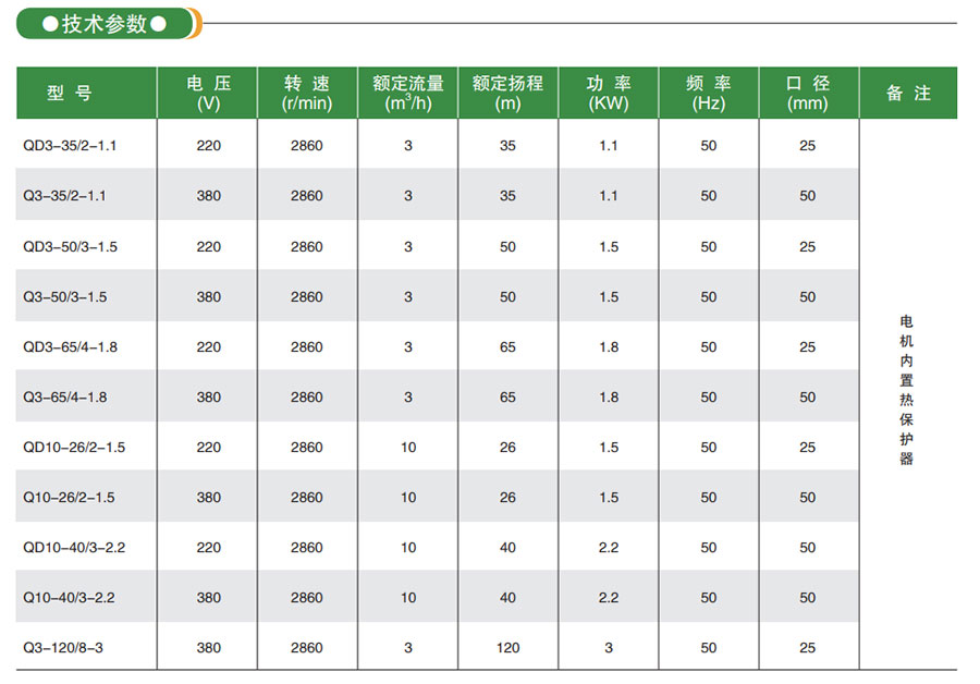 QD、Q小型多級(jí)潛水電泵由水泵、密封和電動(dòng)機(jī)三部分組成,電動(dòng)機(jī)位于電泵下部,為單相或三相異步電動(dòng)機(jī);水泵位于電泵上部,為多級(jí)離心式葉輪、徑向?qū)~結(jié)構(gòu);水泵與電動(dòng)機(jī)之間采用雙端面機(jī)械密封,各固定止口處采用“O”型耐油橡膠密封圈作靜密封。