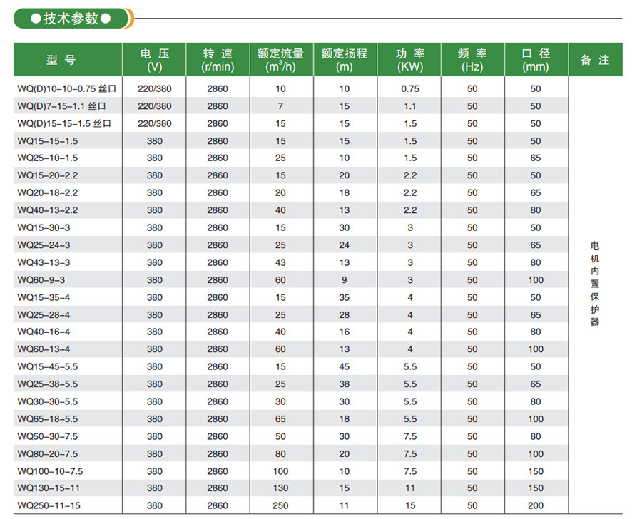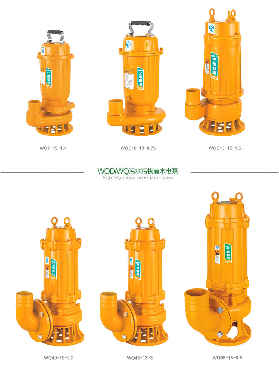 WQ系列電泵由水泵、密封和電動機三部分組成,電動機位于電泵上部,為單相或三相異步電動機;水泵位于電泵下部,為流道式葉輪、蝸殼結(jié)構(gòu);水泵電動機之間采用機械密封,各固定止口密封處采用"O"型耐油橡膠密封圈做靜密封,確保電泵的可靠性。電泵轉(zhuǎn)子軸采用優(yōu)質(zhì)鋼材,確保軸有更可靠的機械強度,可有效提高軸的耐磨性和耐腐蝕性,同時也便于葉輪的維修拆卸。